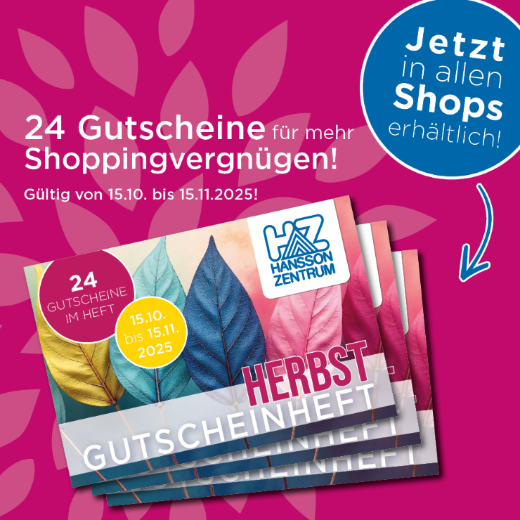 shoma2025-10-14T08:08:14+00:00Der Herbst wird noch schöner – mit dem neuen Gutscheinheft des Hanssonzentrums!Ab 15. Oktober 2025 wartet wieder jede Menge Shoppingvergnügen auf Sie: 24 attraktive Gutscheine aus unseren Shops sorgen für tolle Angebote, Rabatte und kleine Extras für Ihren Einkauf. Ihre Vorteile auf einen Blick: 24 exklusive Gutscheine im Heft Gültig von 15.10. bis 15.11.2025 Einlösbar in allen teilnehmenden Shops des Hanssonzentrums Ideal für alle, die sich oder anderen etwas Gutes tun möchten Das Gutscheinheft erhalten Sie ab sofort in allen Shops im Hanssonzentrum! Kommen Sie vorbei, stöbern Sie durch unsere Geschäfte und sichern Sie sich Ihre Lieblingsangebote.Wir wünschen Ihnen viel [...]